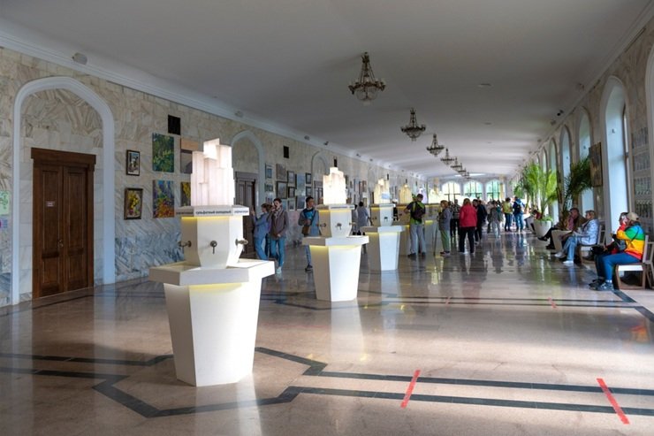 Здание напоминает небольшой замок с башенками и арками, а внутри — мраморные полы и питьевые бюветы с тремя видами нарзана: общим, сульфатным и доломитовым. Последний отличается более плотным минеральным вкусом, его обычно пробуют маленькими глотками. Кстати, в галерею лучше приходить с утра, когда поменьше народу.