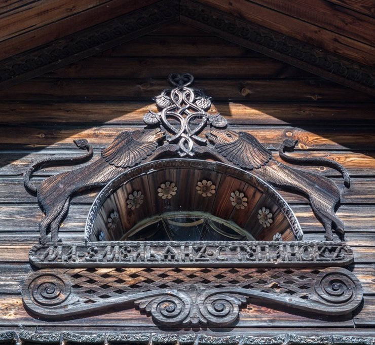 Резьба на доме ещё одного лесоторговца Серова (1873 г. п.). Имя на плашке, на которой стоят львы, принадлежит строителю дома, он же резчик. Фото: Maria Luisa Cianca / Shutterstock / Fotodom
