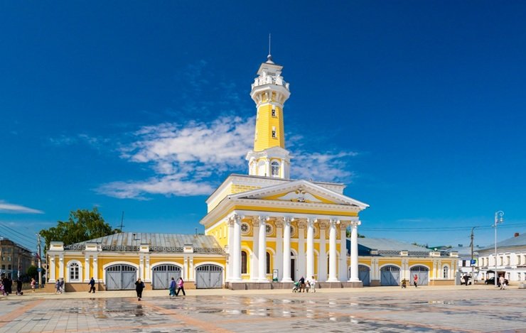 На Сусанинской площади расположена одна из самых узнаваемых и колоритных достопримечательностей Костромы — пожарная каланча, построенная в XIX веке в стиле позднего классицизма, объект культурного наследия. Она служила не просто наблюдательной башней — с её высоты пожарные следили за городом и предупреждали об опасности.