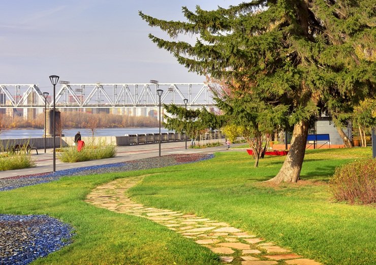 Отсюда открывается живописный вид на реку, мосты и левый берег города. Особенно красиво вечером, когда включается подсветка. В мае на набережной цветут розовые яблони, а зимой заливают каток и строят ледовый городок.