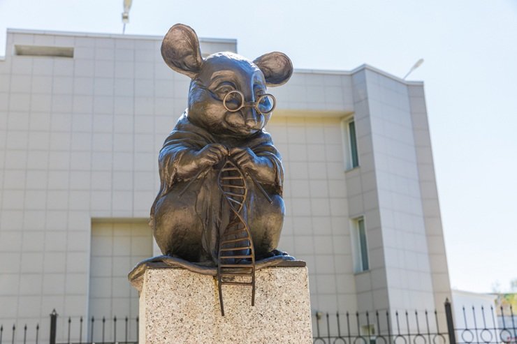 Помимо этого, на территории Академгородка установлены необычные монументы. В сквере около Института цитологии и генетики стоит самый известный из них — памятник лабораторной мыши как символ благодарности животным за вклад в развитие науки. Мышь вяжет спираль ДНК.