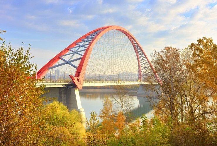 Бугринский мост не только красивый, но и самый крупный арочный мост в России, пролёт которого составляет 380 метров. При строительстве использовался уникальный метод вертикально-радиальной надвижки арки, при котором части конструкции собирались на берегу и поэтапно устанавливались на опоры над водой. Благодаря этому судоходство не блокировалось на время строительства моста.