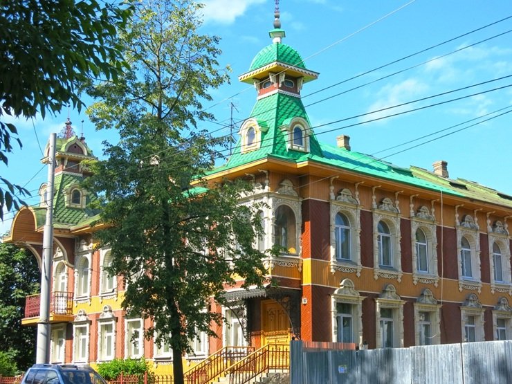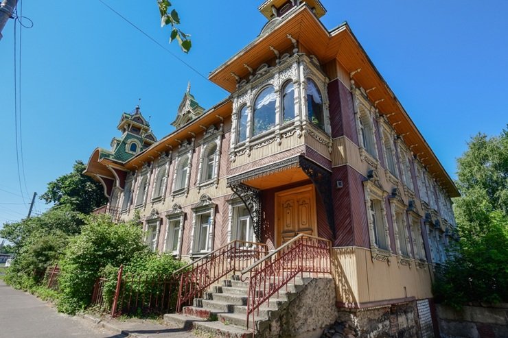 Напротив католической церкви расположился Дом художника — один из самых колоритных уголков Рыбинска. Этот двухэтажный особняк с башенками, резными наличниками и ажурным балконом напоминает сказочный терем. Здание в русском стиле построил купец Семён Гордеев в 1900 году: на первом этаже у него работала лавка, а наверху жила семья.