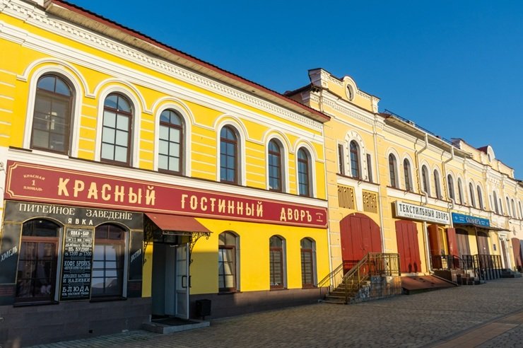 Начать знакомство с городом стоит с Красной площади — исторического центра торговли и одной из главных достопримечательностей Рыбинска. Раньше её называли Крестом, потому что площадь находится на пересечении главных улиц — Крестовой и Стоялой. Здесь располагались торговые ряды, где можно было купить всё что угодно: бытовую химию, продукты, ткани.