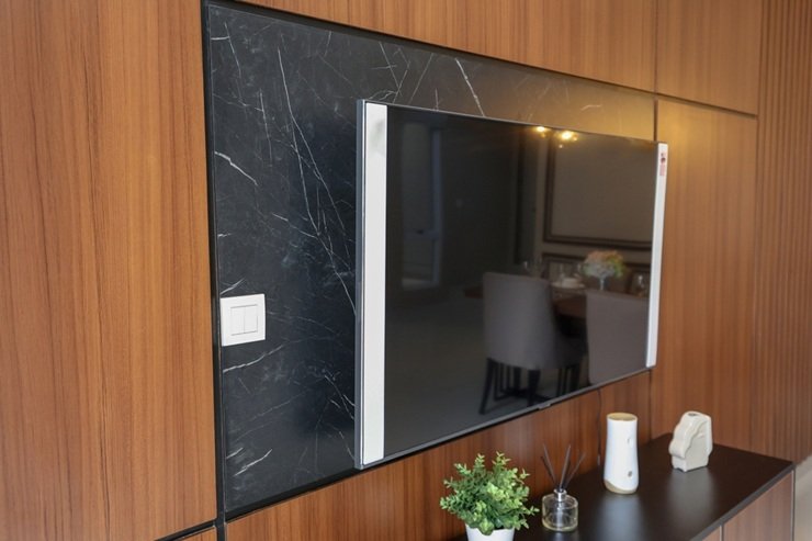 Особенно популярны реечные панели, или ламели — узкие длинные полосы в виде реек. Чаще их выбирают не на всю стену, а для выделения отдельных зон или ниш, иногда для акцентной стены.