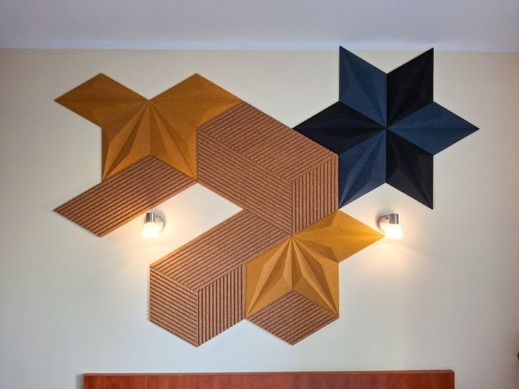 Другой вариант — цельные плитки из фетра или войлока. Лёгкие, экологичные, гасят шум. Их часто используют в детских и спальнях, в зоне возле компьютера и ТВ для поглощения шума. Снижают эхо и создают ощущение тепла.