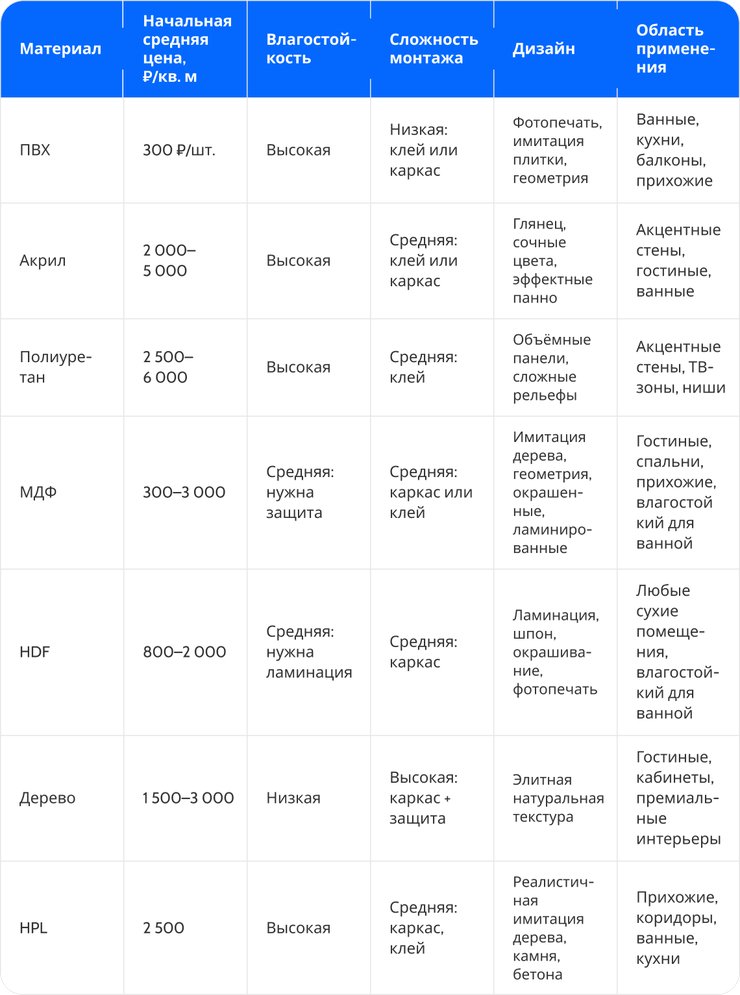 - Сравнительная таблица популярных материалов стеновых панелей