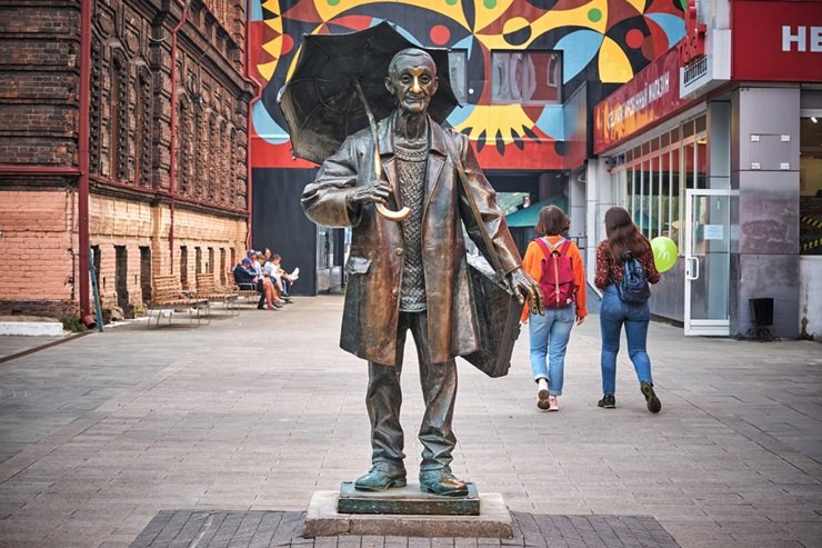 3. Перед университетом на тротуаре, поближе к людям, стоит милый памятник известному сибирскому художнику Андрею Поздееву. Его добрая улыбка и мудрый взгляд обращают на себя внимание прохожих, многие трут нос творца на удачу. Зонт в руках художника символизирует купол, а под ним — уникальную вселенную Андрея Поздеева.