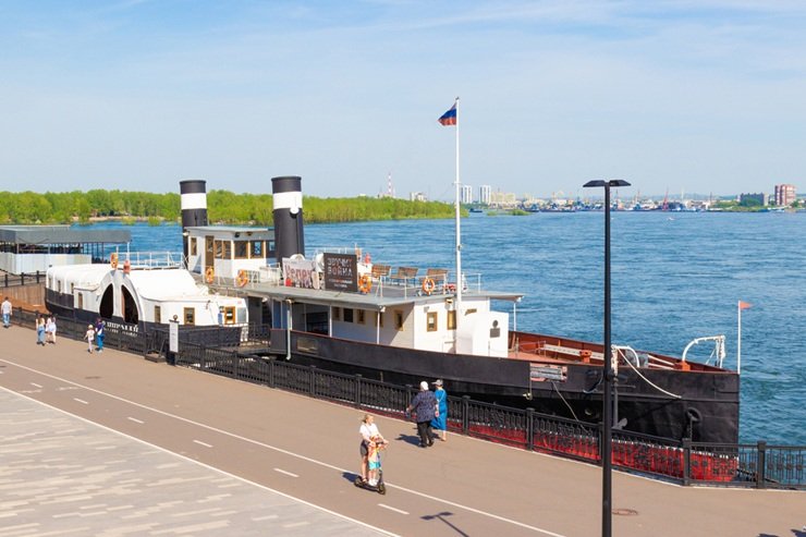 Историческое судно у причала на набережной Енисея. На нём в 1891 году прибыл в Красноярск Николай II, а в 1897-м отправился в ссылку Владимир Ленин. Сейчас пароход используют как музей, работают экспозиции, которые посвящены истории судоходства на Енисее, и многие другие.