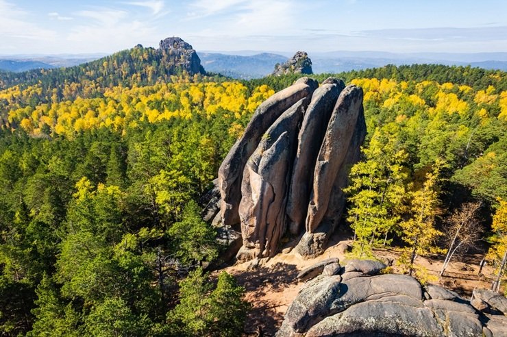 Национальный парк «Столбы» известен своими необычными скальными образованиями: их формы напоминают животных, мифологических существ, людей, а высота достигает 100 м. Древние сиенитовые выступы, возраст которых 250–450 миллионов лет, возникли в результате сложных геологических процессов, в том числе извержений вулкана. Особенно популярны скалы «Дед», «Перья» и «Львиные ворота».