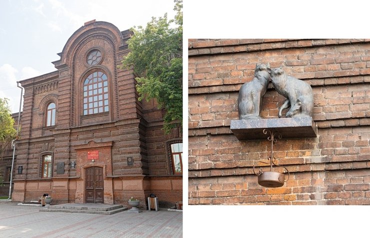 2. На стене университета примерно на высоте двух метров на выступе сидят две бронзовые кошки, под которыми висит тарелка, куда кидают монетки для исполнения желаний. Забросишь монетку с первого раза — желание сбудется. Правда, тарелка предназначается для кормления птиц. Она уже не раз пропадала, каждый раз её восстанавливают.