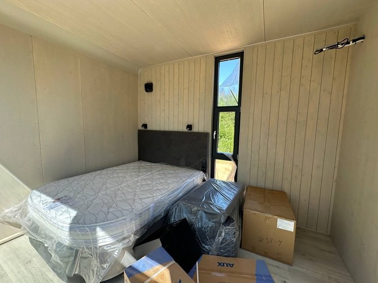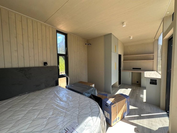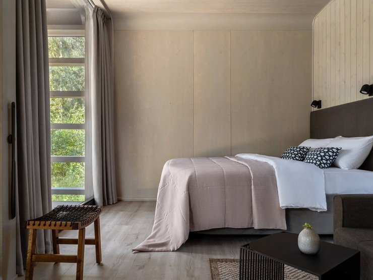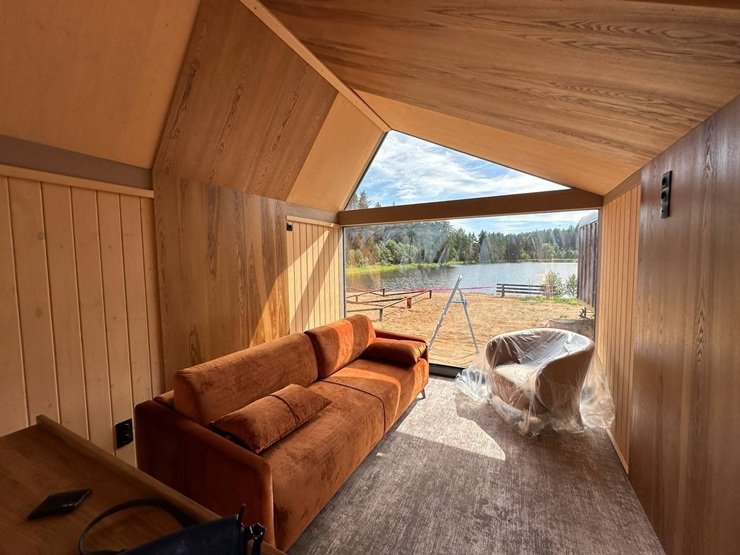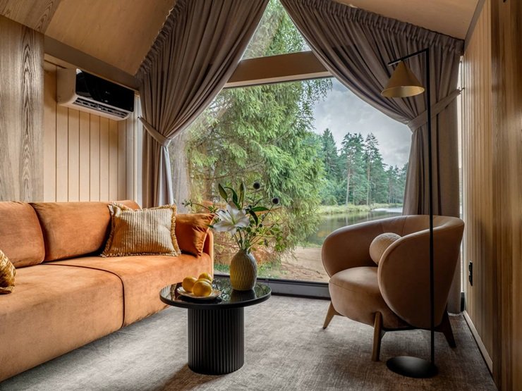 Разберём пример с базой отдыха на Валдае. Проект создавался в заповедной зоне, поэтому было важно не перегружать пространство яркими решениями. Главная задача — вписать домики в природный ландшафт так, чтобы они выглядели частью среды и создавали ощущение гармонии и единства с окружающей природой. Для отделки выбрали натуральные материалы и спокойные оттенки. Такой подход позволил домикам выглядеть органично и помогал гостям почувствовать атмосферу отдыха вдали от городской суеты.