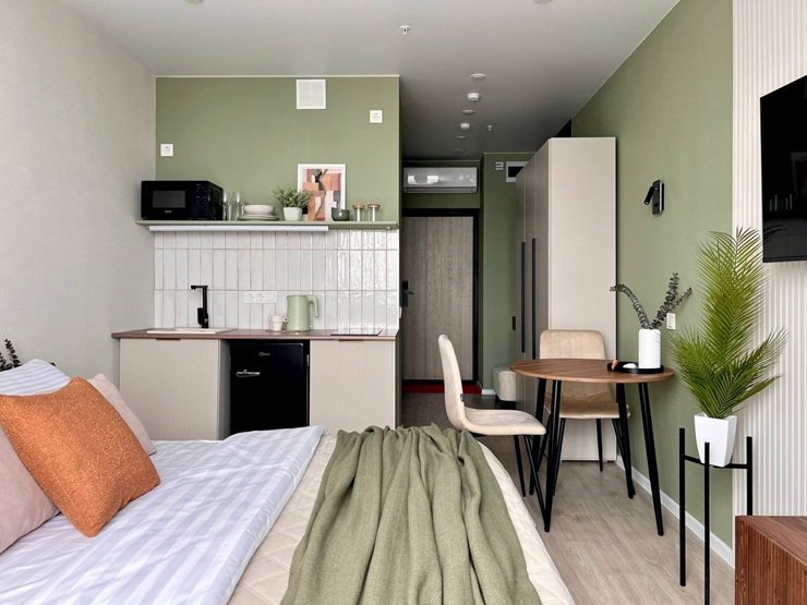 В итоге для интерьера выбрали оливковую гамму с терракотовыми акцентами — такой цвет сразу выделял квартиру среди десятков других объявлений. При этом решение универсальное: оно одинаково хорошо воспринимается и мужчинами, и женщинами. Атмосфера получилась уютной, спокойной, без раздражающих деталей. Но и скучной её не назовёшь — за счёт фактурных реек и цветовых акцентов интерьер хочется рассматривать.