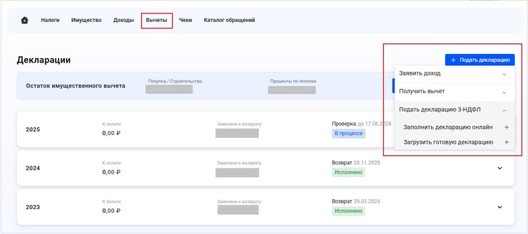 2. Подать декларацию через личный кабинет налогоплательщика на сайте Федеральной налоговой службы: раздел → «Вычеты» → Подать декларацию → Подать декларацию 3-НДФЛ. Далее можно либо заполнить её онлайн прямо на сайте, либо прикрепить готовый вариант, заполненный в программе.