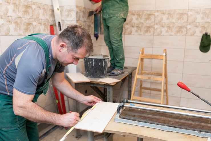 Плитки, которые не помещаются целиком, нужно подрезать. Делается это либо плиткорезом — он делает чистый, ровный срез, либо болгаркой с алмазным диском — для фигурной резки или сложных участков вокруг труб, розеток, углов.
