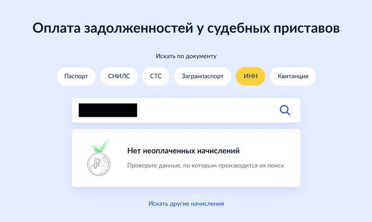 1. Портал «Госуслуги». На сайте или в приложении наберите в поисковой строке «Данные о задолженности физлица», в результатах поиска выберите «Проверить задолженность». Вас переадресуют на страницу «Оплата задолженностей у судебных приставов», где по ИНН, паспорту, СНИЛС и т. д. можно искать долги. Если таких начислений нет — появится соответствующая запись.