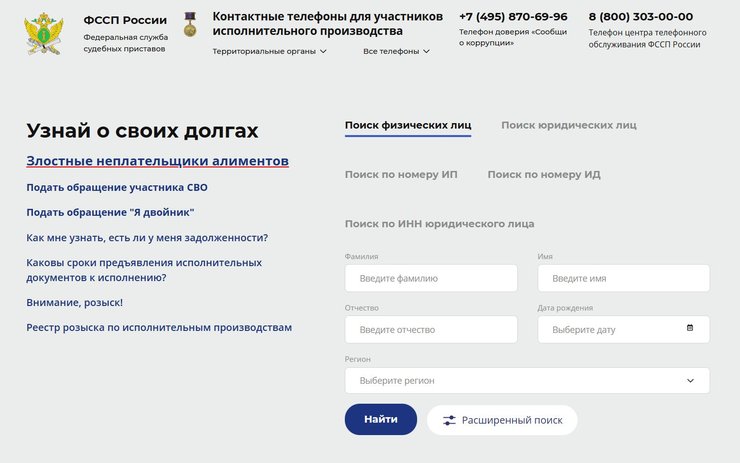 Если у вас есть номер исполнительного документа, на основании которого пристав начал процедуру взыскания долга, или номер исполнительного производства, вы можете узнать сумму долга на сайте ФССП. В форме расширенного поиска есть опция поиска по этим параметрам.