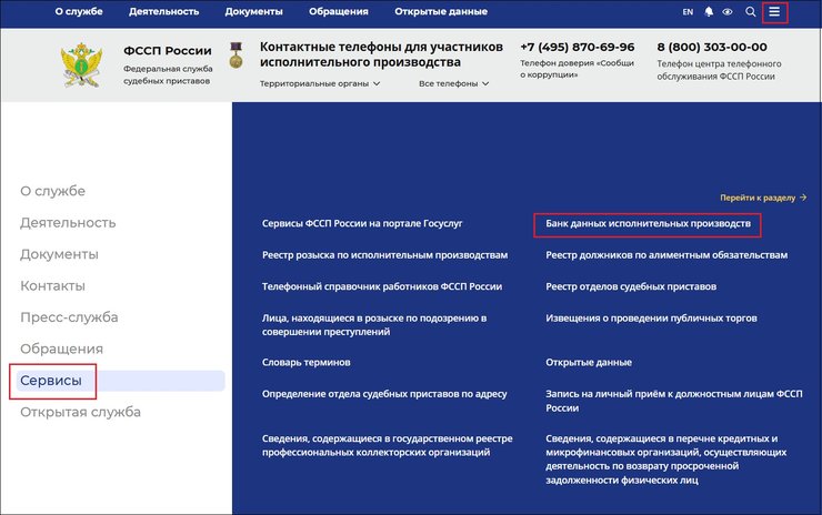 Поиск также можно провести через раздел «Банк данных исполнительных производств». Для этого на главной странице нажмите пиктограмму с тремя полосками в правом верхнем углу страницы, выберите раздел «Сервисы» в открывшемся левом меню, а затем «Банк данных исполнительных производств».