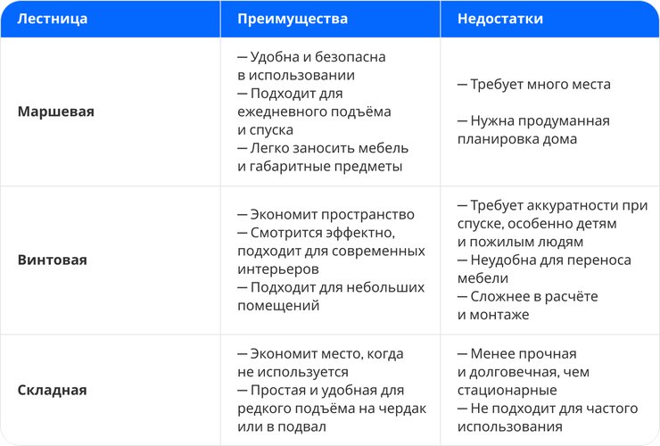 Лестница может быть эффектной, компактной или максимально удобной, но редко всё сразу. Собрали плюсы и минусы разных лестниц в таблицу: