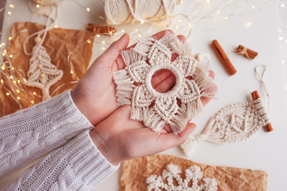 Её вешают в нишу или просто на свободную стену и украшают гирляндой на батарейках и игрушками из натуральных материалов — дерева, льна, металла.