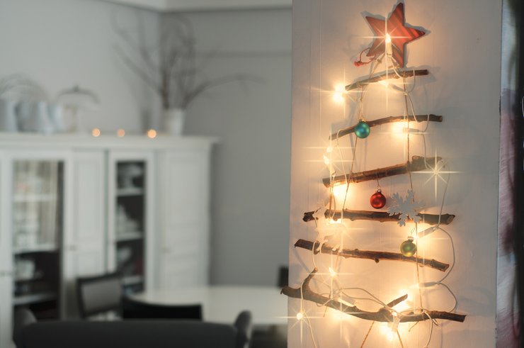 — Плоскую ёлку: текстильную, деревянную, из палок и шпагата или даже картонную — повесить на стену. Её можно украшать, как и обычную, и даже прикрепить к ней гирлянду.