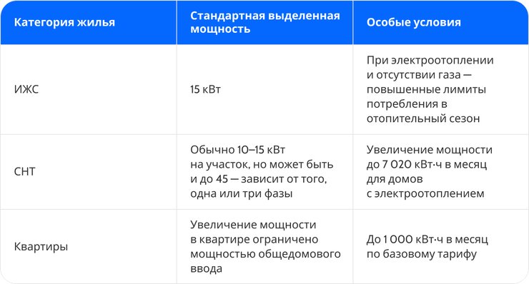 Регионы увеличили лимит мощности электроэнергии для домов с электроотоплением, чтобы зимой счета не настолько сильно били по карману. Если негазифицированный дом отапливается электричеством, то потреблять можно до 7 020 кВт·ч в месяц по низкому тарифу. Для остальных категорий действует стандартный порог объёма потребления — от 1 200 до 3 900 кВт·ч в зависимости от региона и наличия электроплит.