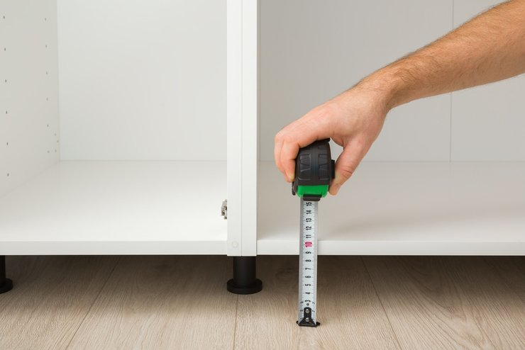 Высота нижних ящиков — это не окончательная высота нижнего яруса кухни. Снизу будут ножки (подумайте, хотите ли вы закрыть их плинтусом), а сверху — столешница. Важно решить, какой высоты будет вся эта конструкция.