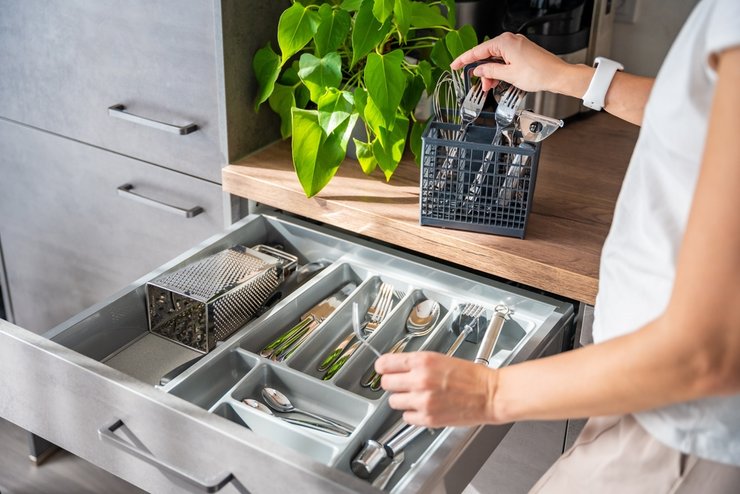 Обязательно отведите место для шкафа с неглубокими выдвижными ящиками — ничего более практичного для столовых приборов и всяческих лопаток до сих пор не придумано.