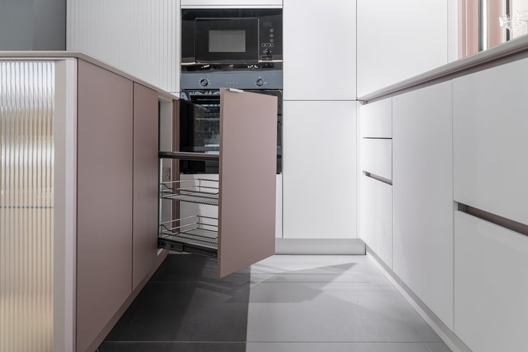 — Выдвижные системы удобнее распашных шкафов и оптимально используют пространство, но для тяжёлой посуды лучше подойдёт шкаф с полками.