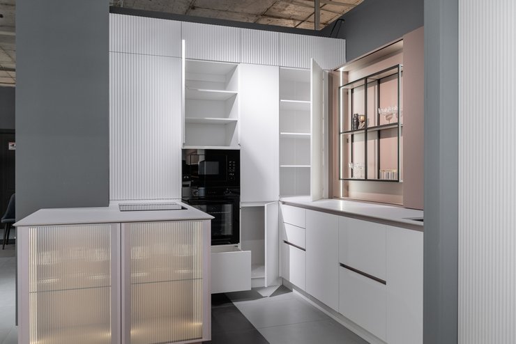 Фурнитура напрямую влияет на то, насколько удобной будет кухня в повседневном использовании. Фурнитура включает петли для распашных фасадов, направляющие для выдвижных ящиков, подъёмные механизмы для верхних шкафов, системы для угловых и узких модулей, нажимные механизмы и ручки.