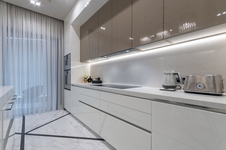Если вы хотите красивую кухню, но не готовы уделять много времени уборке, присмотритесь к матовым фасадам, на них не остаются следы от рук. Фасады без сложного рельефа проще в уходе, а однотонные решения дольше выглядят актуально.