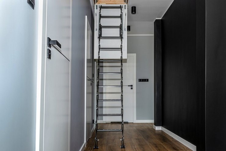 Подходят для помещений вроде чердаков и мансард, в которые заглядывают не каждый день. В сложенном виде лестницы убирают в нишу на потолке, чтобы не занимали место.