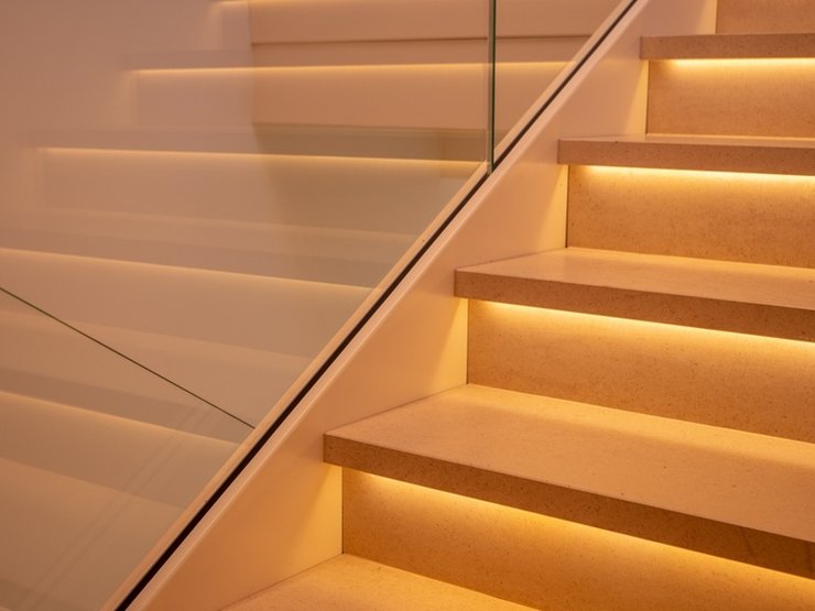 → Освещение. Лучше установить подсветку ступеней или повесить бра над площадками. Дежурный свет в ночное время позволит домочадцам не спотыкаться в темноте.
