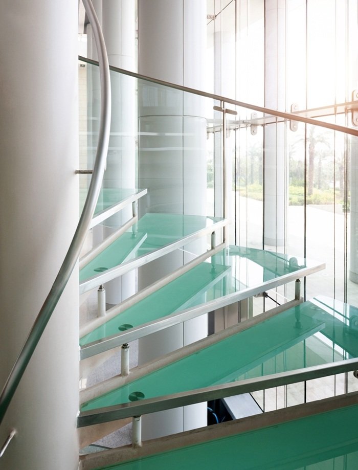 Такие лестницы монтируют на косоурах или больцах, а ступени делают из закалённого двух- и трёхслойного стекла. Оно прочнее обычного, поэтому выдерживает вес человека. Многослойность означает, что между пластинами есть пленка. С ней разбитое стекло трескается, но не рассыпается на острые осколки.