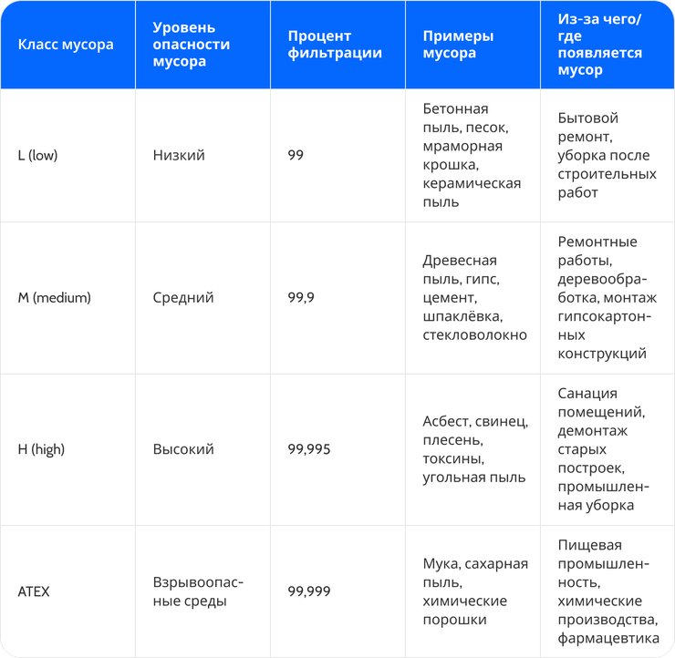 Пылесосы для ремонта и строительства делятся на 4 класса: L — для нетоксичной пыли (песок, опилки), M — для среднеопасных материалов (цемент, гипс), H — для токсичных веществ (асбест, свинец) и ATEX — для взрывоопасных сред (горючая пыль).