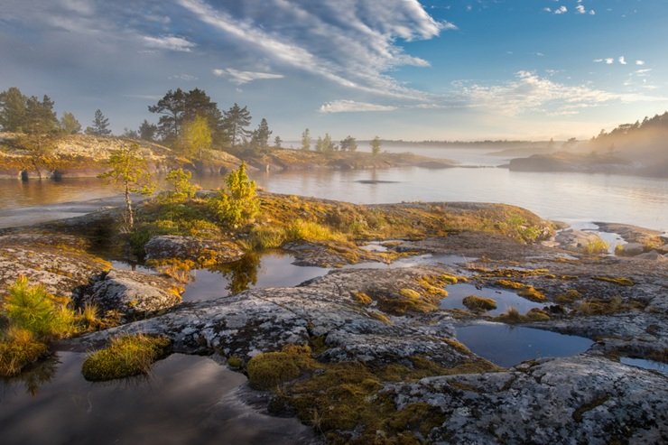 На рассвете над шхерами часто поднимается лёгкий туман, и скалы выглядят как парящие острова.