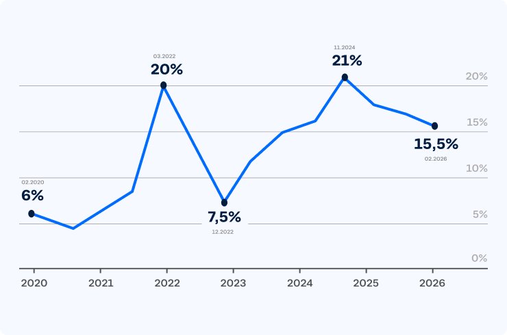 В 2025 году регулятор начал планомерное снижение ставки — за год она снизилась до 16% — и пока поддерживает эту тенденцию. Эксперты считают, что в 2027 году стоит ожидать снижения ключевой ставки до 8–10%.