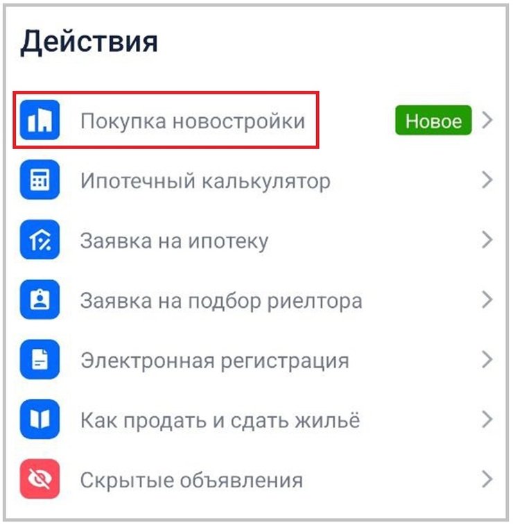 Также к консультанту по новостройкам можно перейти из личного кабинета. Выбираем «Действия» — «Покупка новостройки».