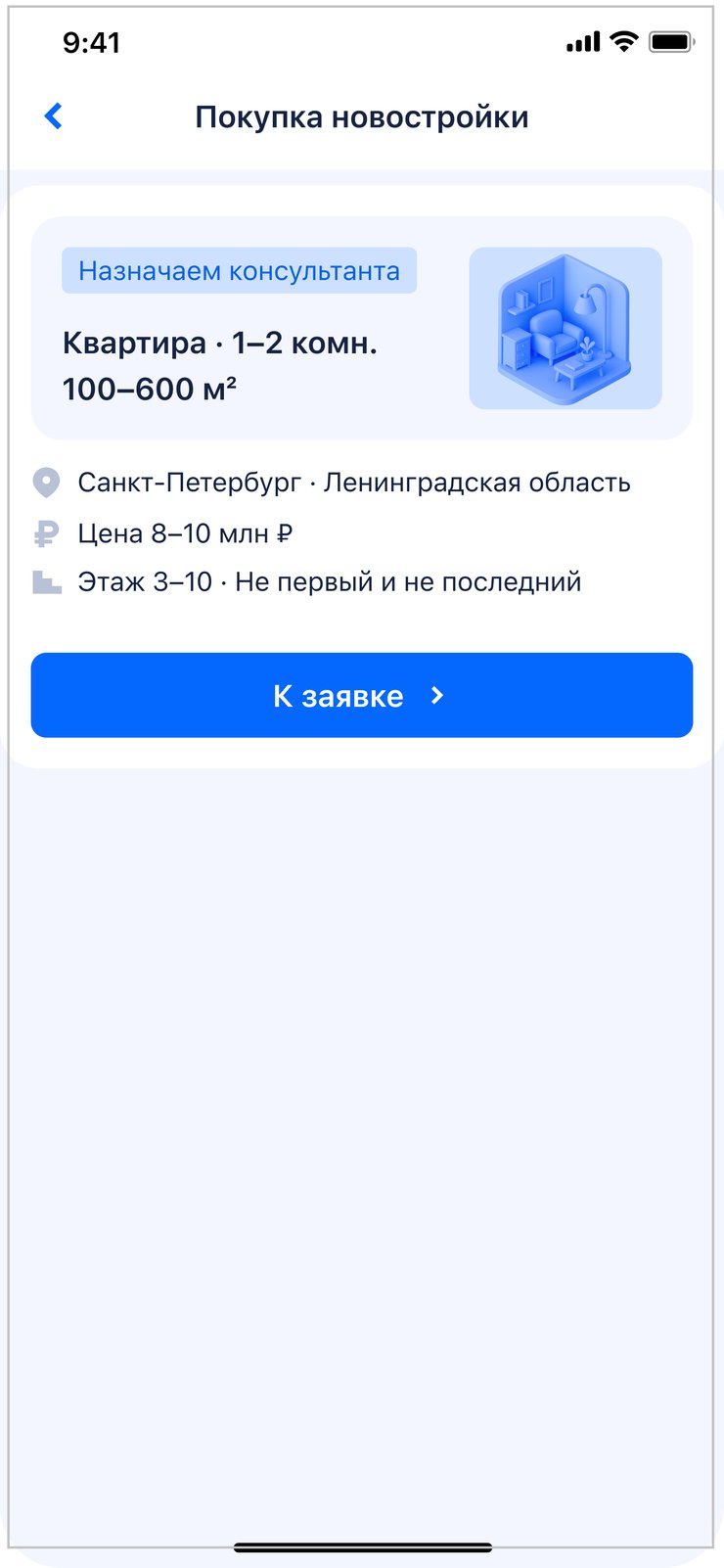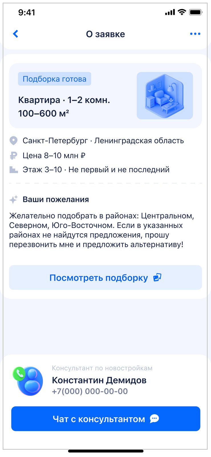 5. С этого момента вы сможете созвониться с консультантом по новостройкам. А в вашей заявке появится активная кнопка «Посмотреть подборку», где будут собраны подходящие варианты квартир.