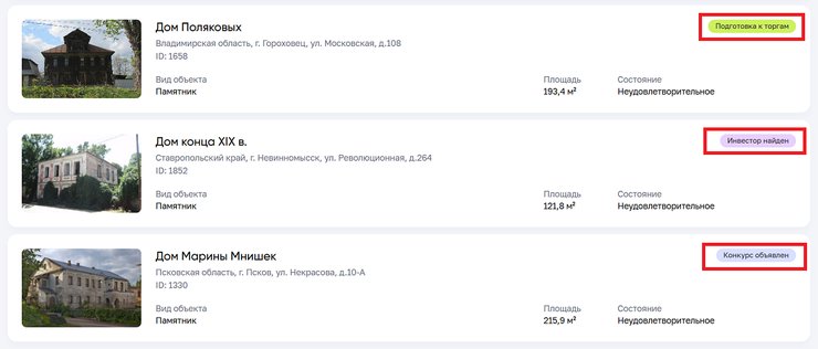 А если приобретение ОКН пока только планируется, выбрать объект можно в каталоге на портале «Наследие.Дом.РФ». Там собраны подходящие для льготного кредитования ОКН в государственной или муниципальной собственности. Сейчас инвесторам доступны сведения о 1 200+ объектах.