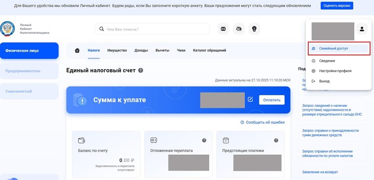 Когда у вас настроен семейный доступ, оплату налог можно из своего личного кабинета на сайте ФНС или через «Госуслуги».