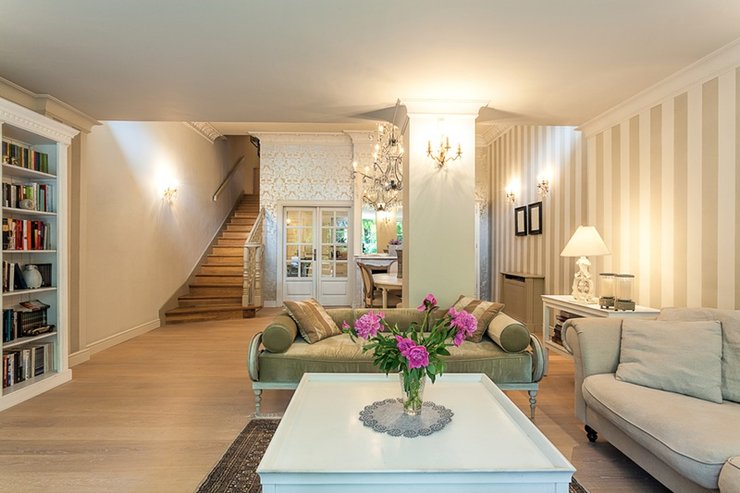 - По стилю интерьера. В классике часто используют полосы, цветы, растения и вензеля, а в современных стилях — геометрические фигуры и абстракции.