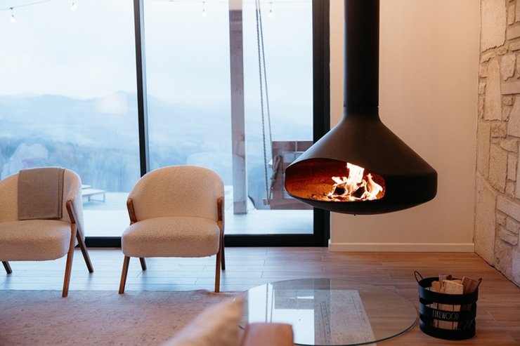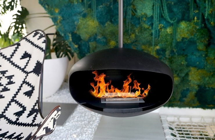 При этом подвесной камин может быть и дровяным, который обогревает помещение. Правда, его КПД будет небольшим из-за открытого очага. Понадобится дымоход.