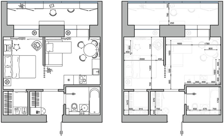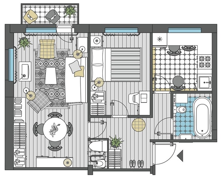 Теперь, когда мы разобрали базовые принципы, рассмотрим примеры планировок 2-комнатной квартиры.