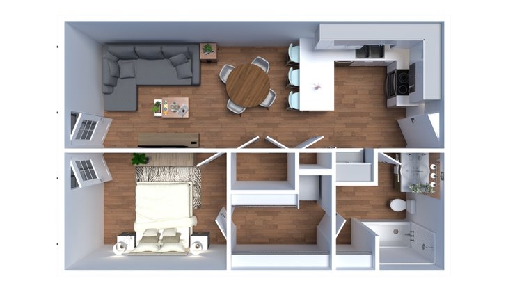 Это удобный вариант для семьи с ребёнком. Кухня может выступать как кухня-гостиная, а спальня и детская будут отдельными изолированными комнатами.
