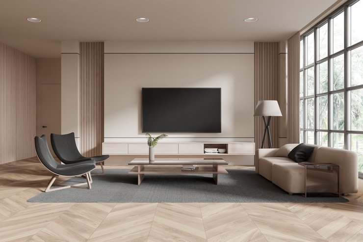 Обычно главный объект в гостиной — это телевизор. Стройте композицию вокруг него: разместите перед ним столик и диван, повесьте снизу тумбу. Фото: ImageFlow / Shutterstock / Fotodom