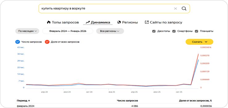 После резонансных публикаций интерес к запросам «купить квартиру в Воркуте» в сети вырос более чем в 10 раз: 31 тыс. запросов в январе 2026 года против 3 тыс. месяцем ранее. Но этот всплеск активности отражает скорее любопытство, чем реальные намерения. Люди на волне инфоповода проверяли, правда ли квартиры в Воркуте стоят так дёшево. Настоящего массового спроса такие цифры не формируют.