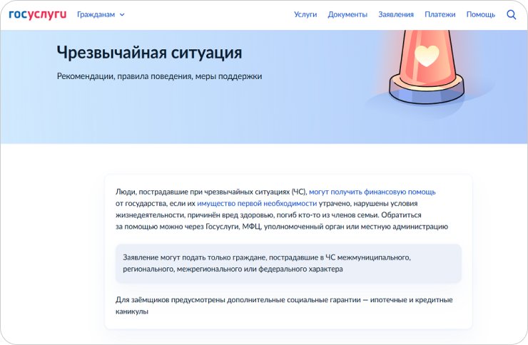 Для удобства можно воспользоваться сервисом-навигатором «Чрезвычайная ситуация» на Госуслугах. Там есть данные о ЧС в регионе за последний год, информация о доступных мерах поддержки и способах подачи заявлений на выплаты.