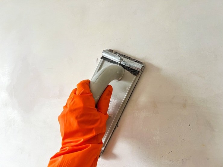 Шлифуют поверхность лёгкими круговыми или восьмёркообразными движениями без сильного нажима. Во время шлифовки выделяется много пыли, поэтому работать лучше в маске или респираторе и защитных очках.