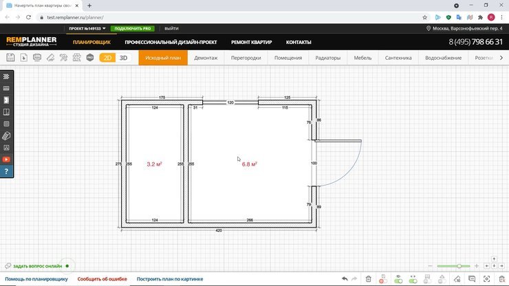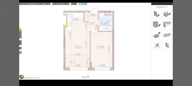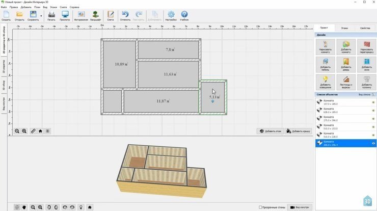 В программе есть возможность менять размер и толщину перегородок и делать пометки, например указывать на плане площадь комнаты. На основе плана можно построить 3D-модель помещения и скачать её на компьютер.